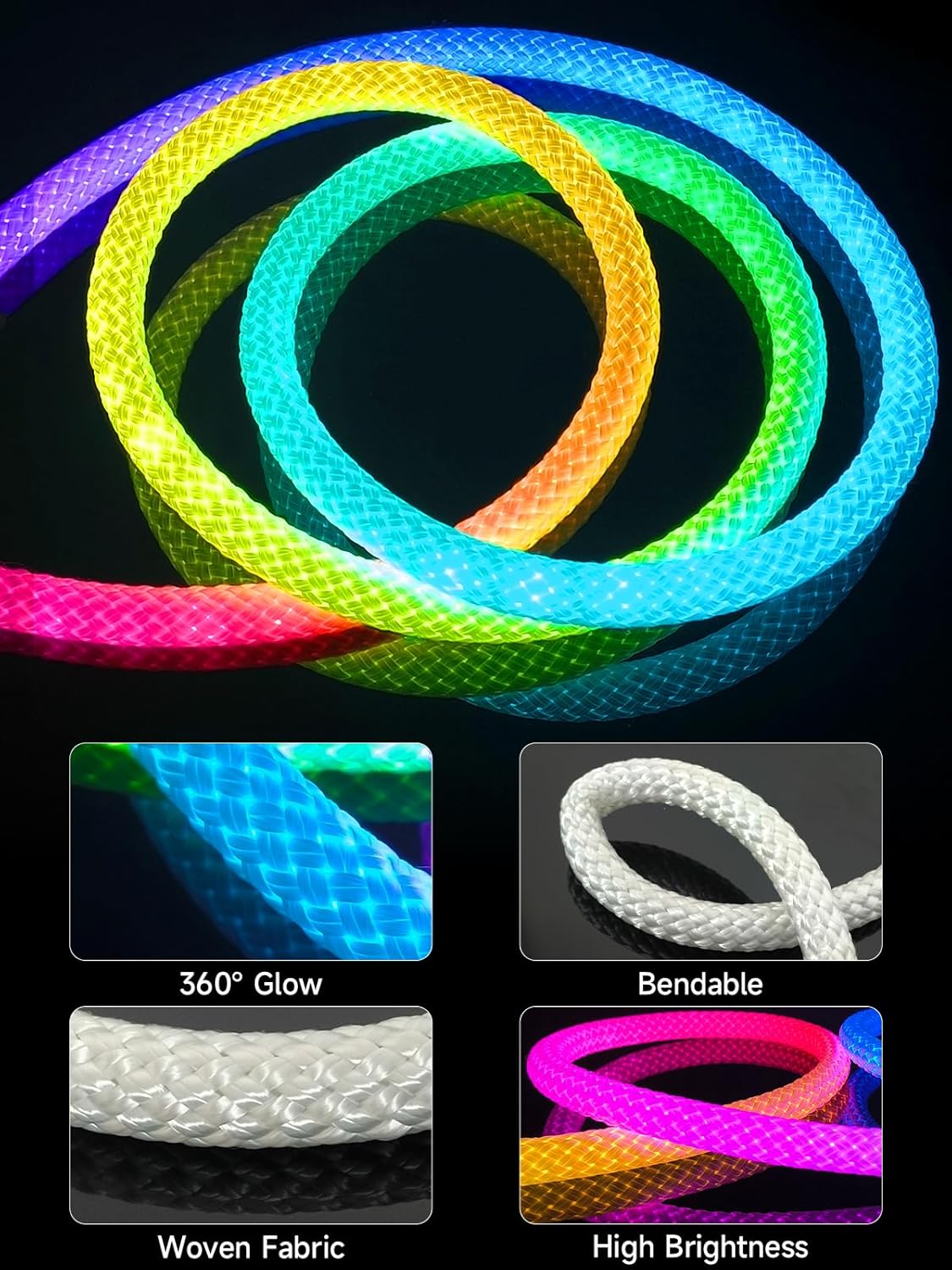- LED rope lights with 360 round tube silicone shell, 360°lighting, uniform light, no dark spots. Nylon mesh weave structure has a more expressive.